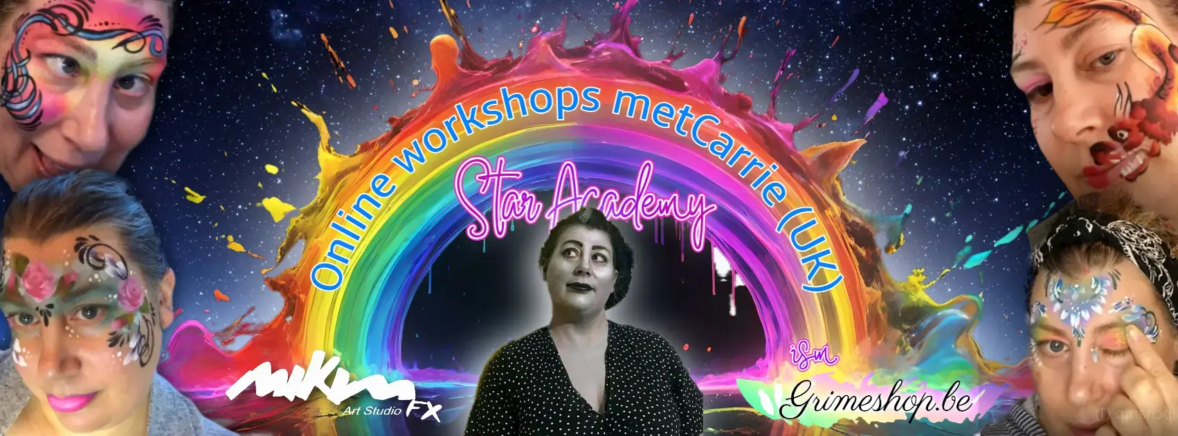 Online bibliotheek met films, docs en lesherhalingen, ... 6 online workshops met Carrie (UK)8 live 3u workshops (leslokaal Gent)Toegang tot communityChallenges met prijzen via communityOlivier's Facepainting Game (online)Toegang tot extra materialenGetuigschriften per live workshop15% korting viawww.grimeshop.be40% korting op extra workshops door MiKimFX georganiseerd-